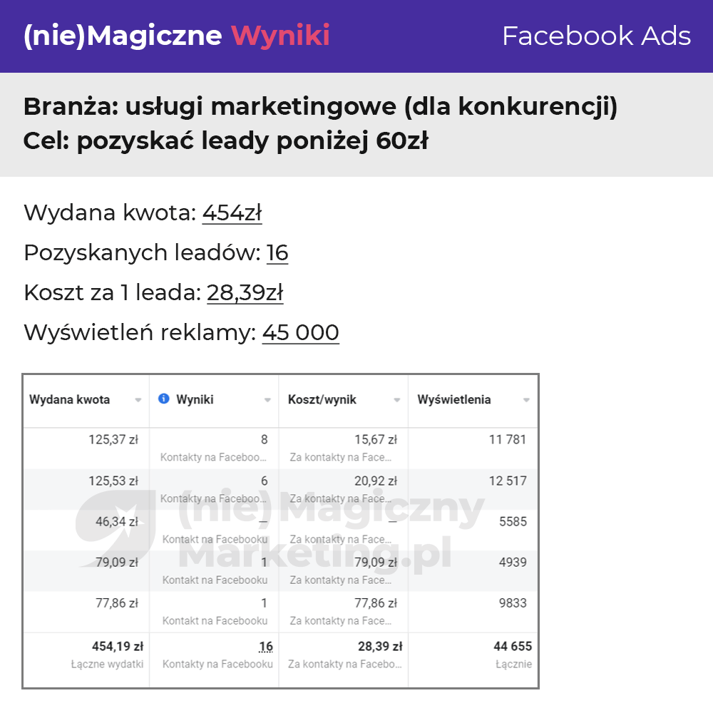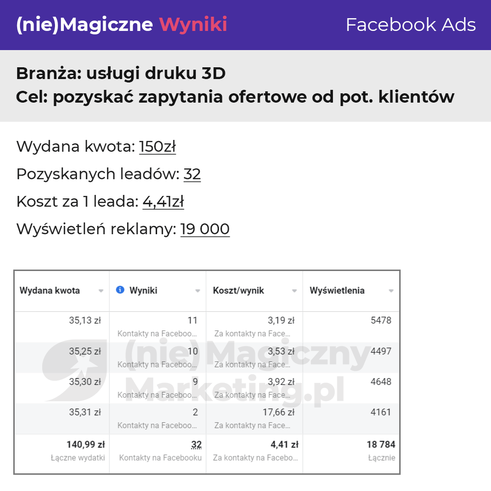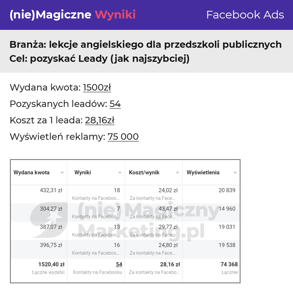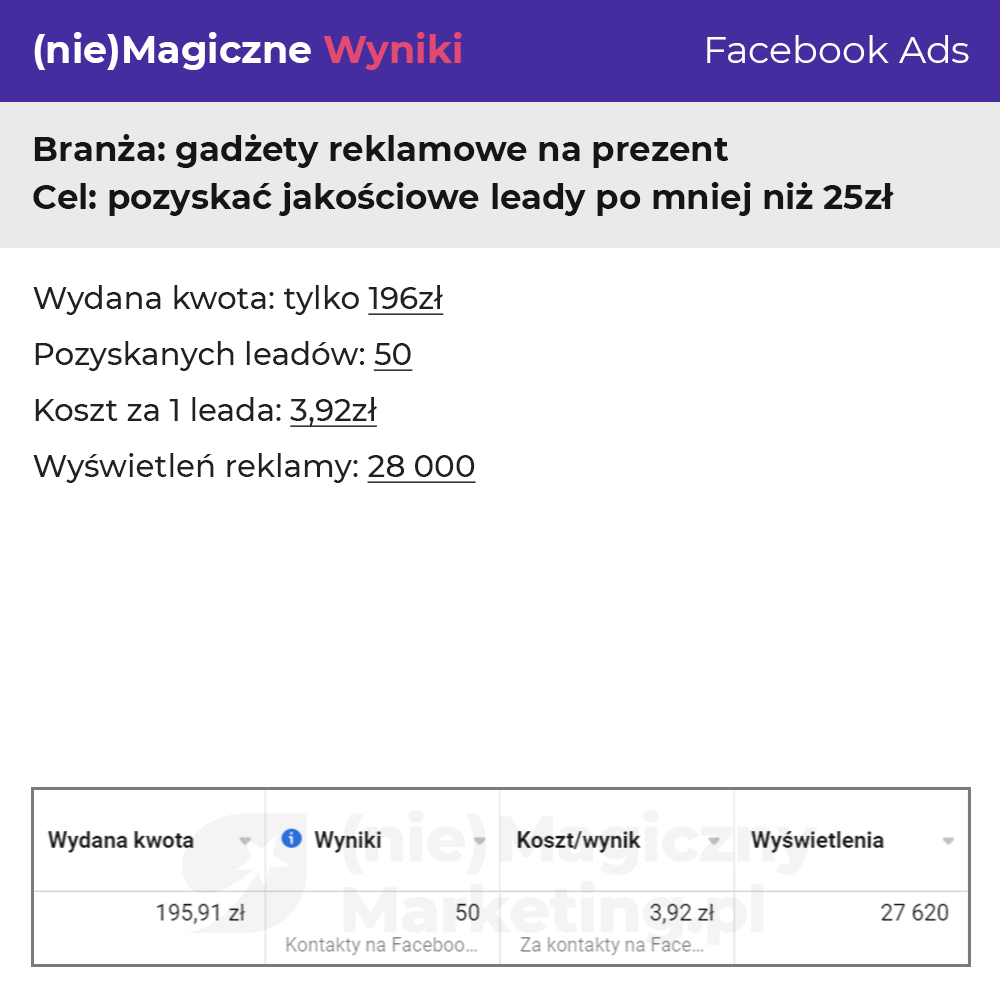Przez pierwszy tydzień nasza kampania reklamowa nie przynosiła dobrych efektów, ponieważ koszt za 1 leada był zbyt wysoki – ale po wyciągnięciu wniosków i po wprowadzeniu nowych reklam rezultaty były bardzo dobre, pojawiły się pierwsze sprzedaże oraz polecenia