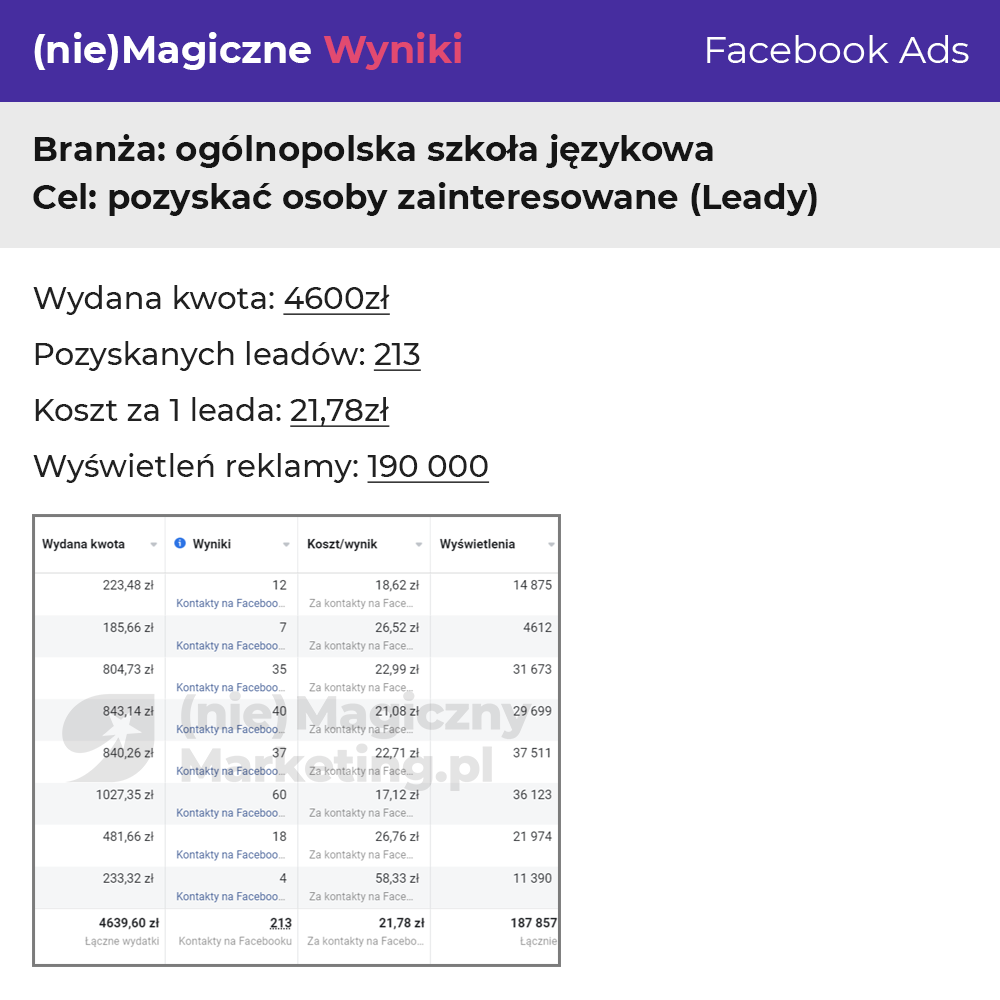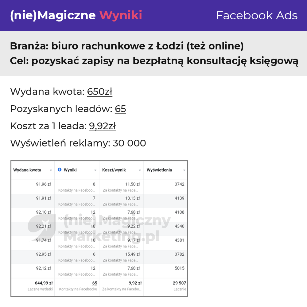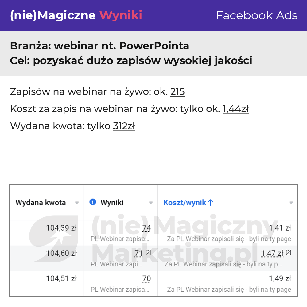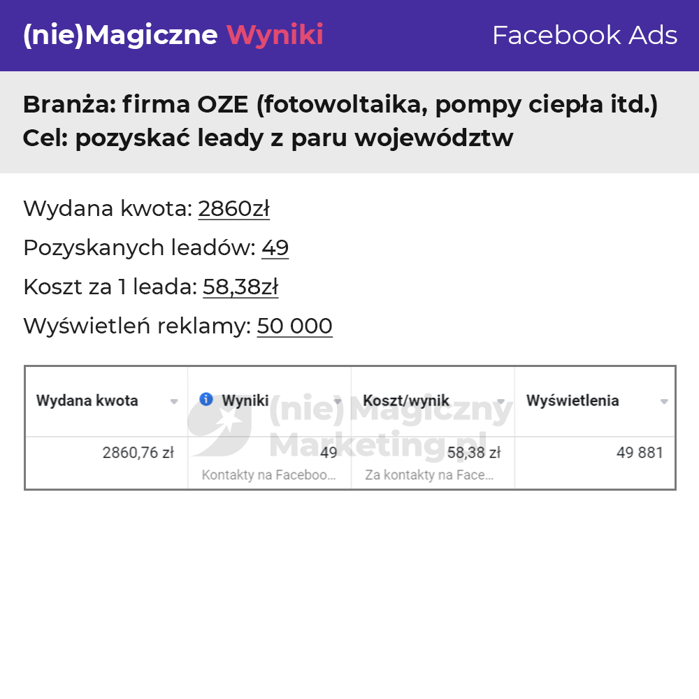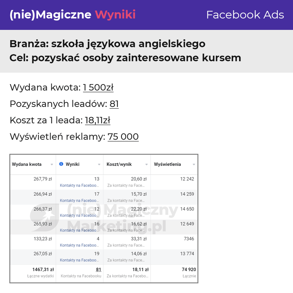 Przez pierwszy tydzień nasza kampania reklamowa nie przynosiła dobrych efektów, ponieważ koszt za 1 leada był zbyt wysoki – ale po wyciągnięciu wniosków i po wprowadzeniu nowych reklam rezultaty były bardzo dobre, pojawiły się pierwsze sprzedaże oraz polecenia